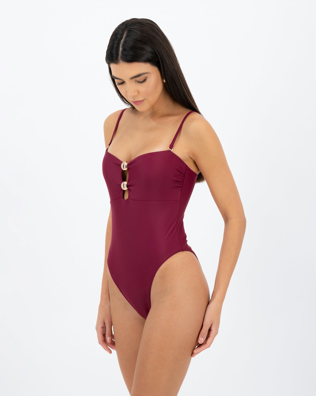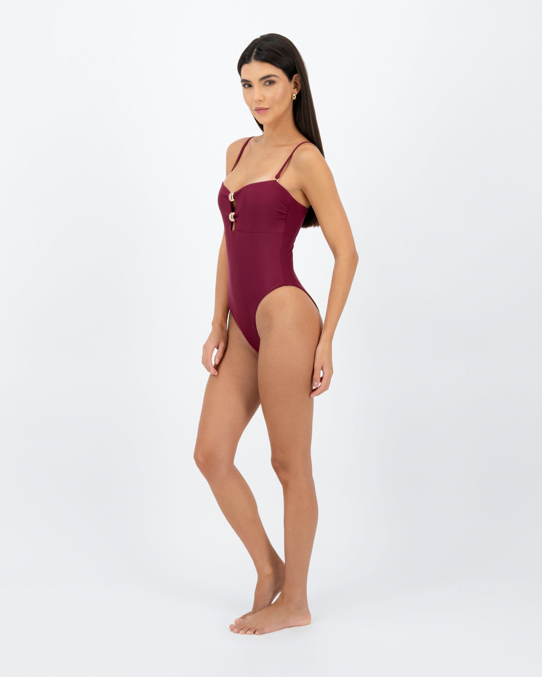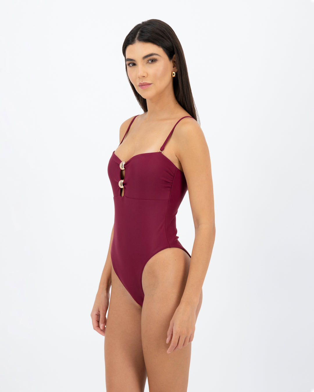 Elevate your swimwear wardrobe with the Midnight One-Piece — a timeless silhouette with a modern edge. Designed in a rich dark Cherry hue, this elegant swimsuit features a flattering straight neckline accented by polished gold-tone ring hardware at the center, creating a subtle cutout detail that enhances and shapes the bust.