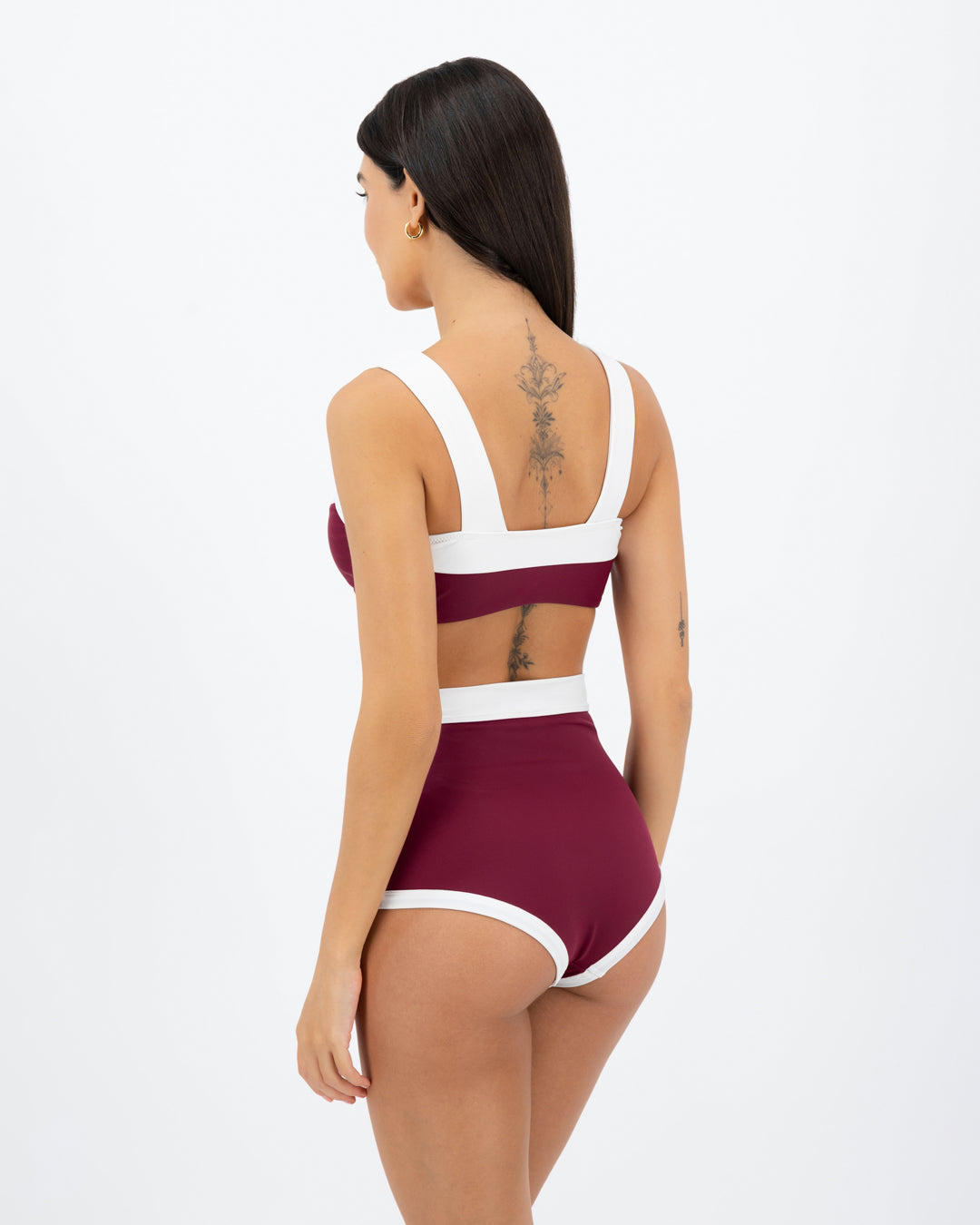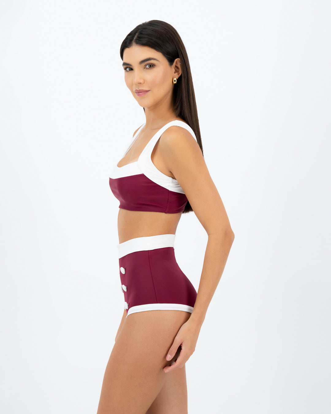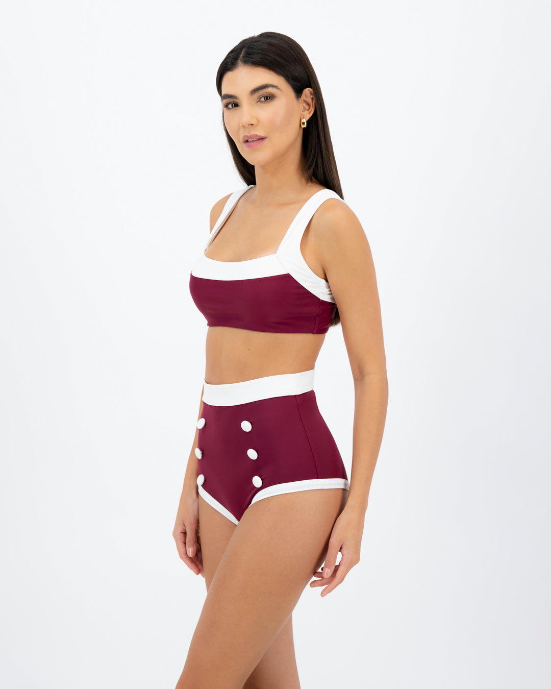 The Monaco Retro Bikini Bottom is a high-waisted style designed to enhance and flatter. Featuring the same deep burgundy tone with fresh white trim, this silhouette sculpts the waist while offering comfortable, confident coverage.